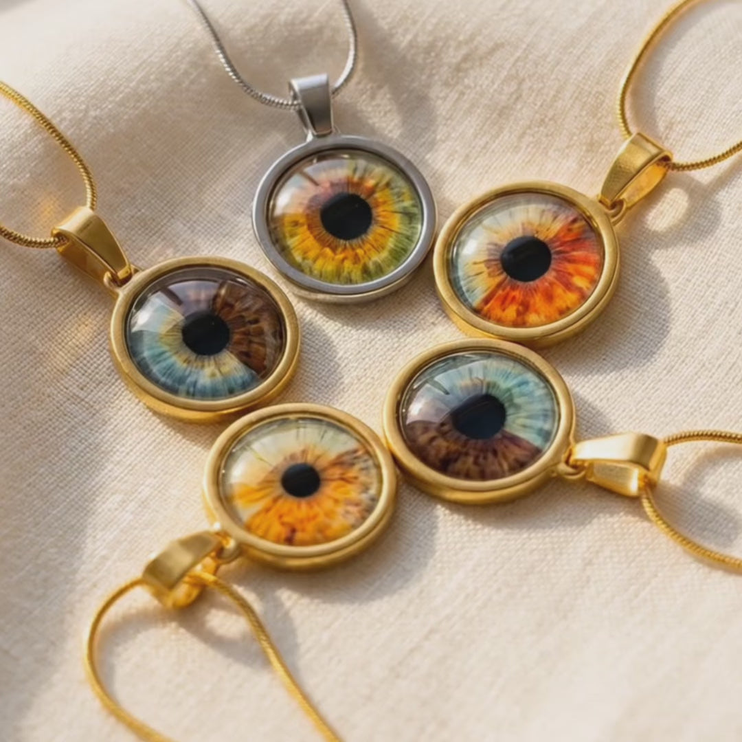 Aus einem echten Iris-Foto entsteht ein einzigartiges Kunstwerk – als Kette, handgefertigt und liebevoll verpackt.